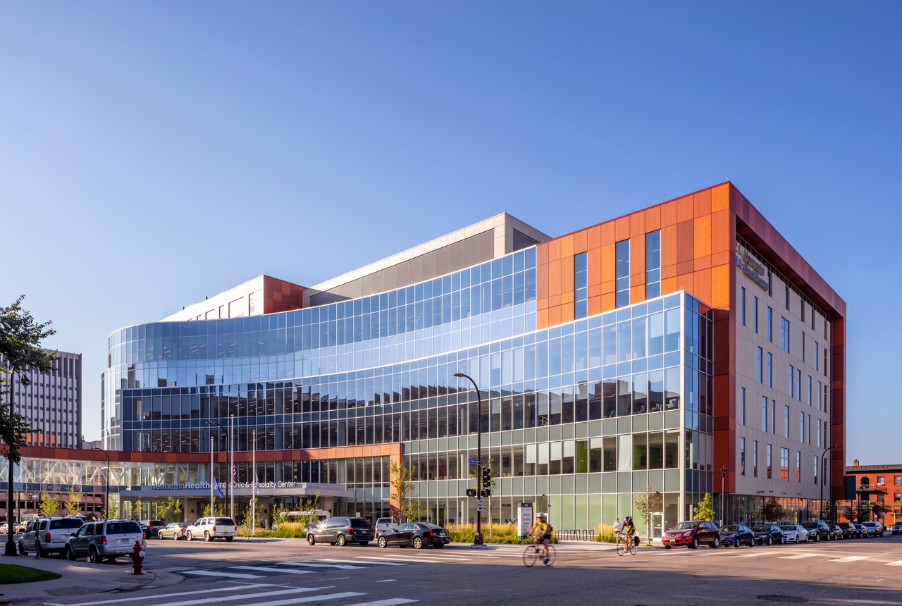 BWBR: Creating a healthy building was a baseline for success of the BWBR-designed Hennepin Healthcare Clinic and Specialty Center. Sunlit staircases, material choices, open space, and a pocket park that incorporates a downtown residential neighborhood were all strategies that incorporated the desires and health needs of staff, patients, and community and earned the facility LEED® Gold certification. (© 2018 Brandon Stengel www.farmkidstudios.com)
