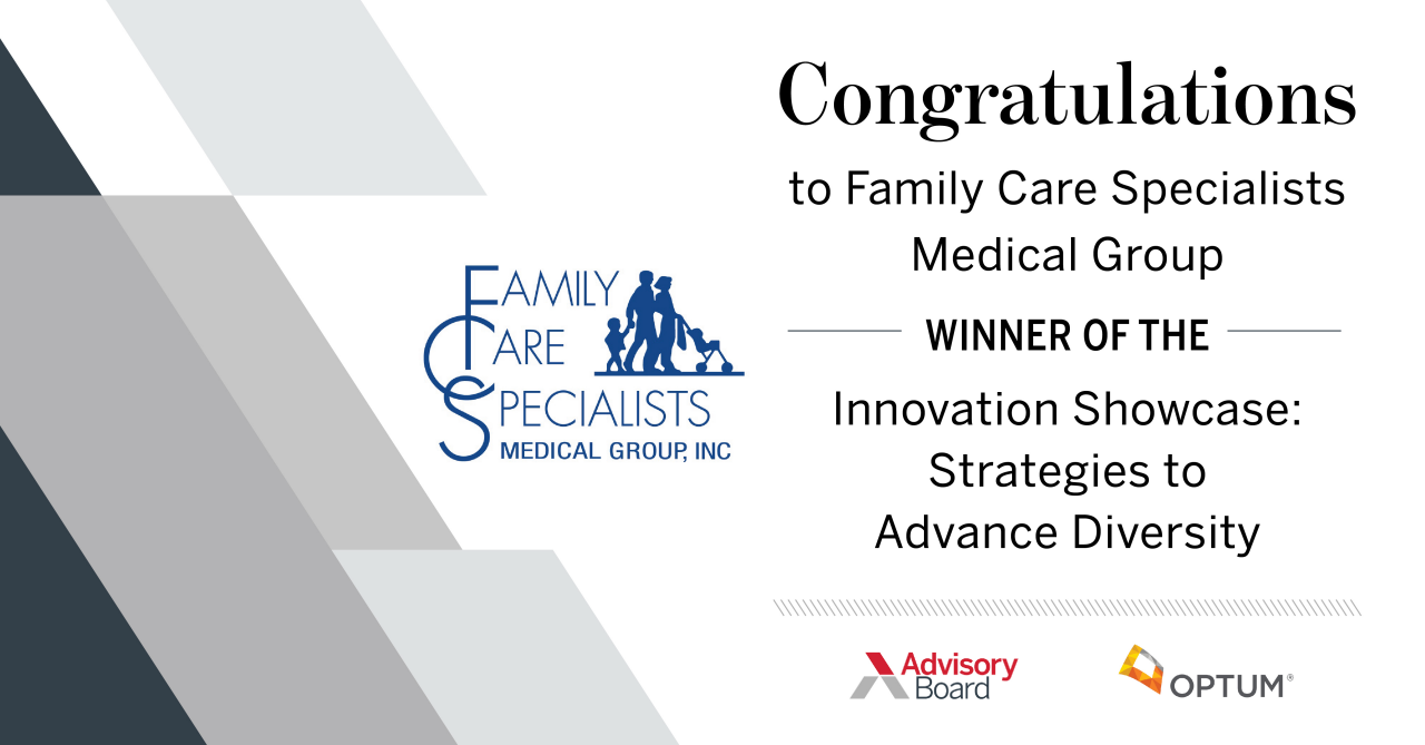 As the winner, Family Care Specialists Medical Group will receive a $10,000 award sponsored by Optum Social Responsibility to invest in their DEI work. Thank you to presenter Dr. Hector Flores for sharing your story.